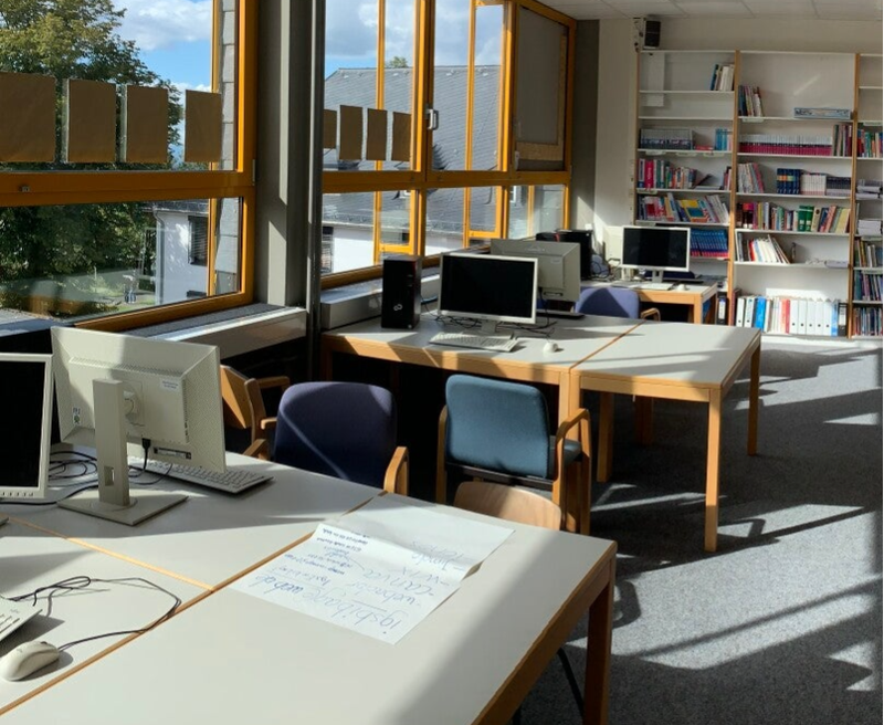 Es stehen Euch 6 PC-Arbeitsplätze, ein umfangreicher Handapparat mit unterschiedlichen Nachschlagewerken und natürlich bei Bedarf immer auch kompetente Unterstützung durch uns oder die aufsichtführende Lehrkraft zur Verfügung.